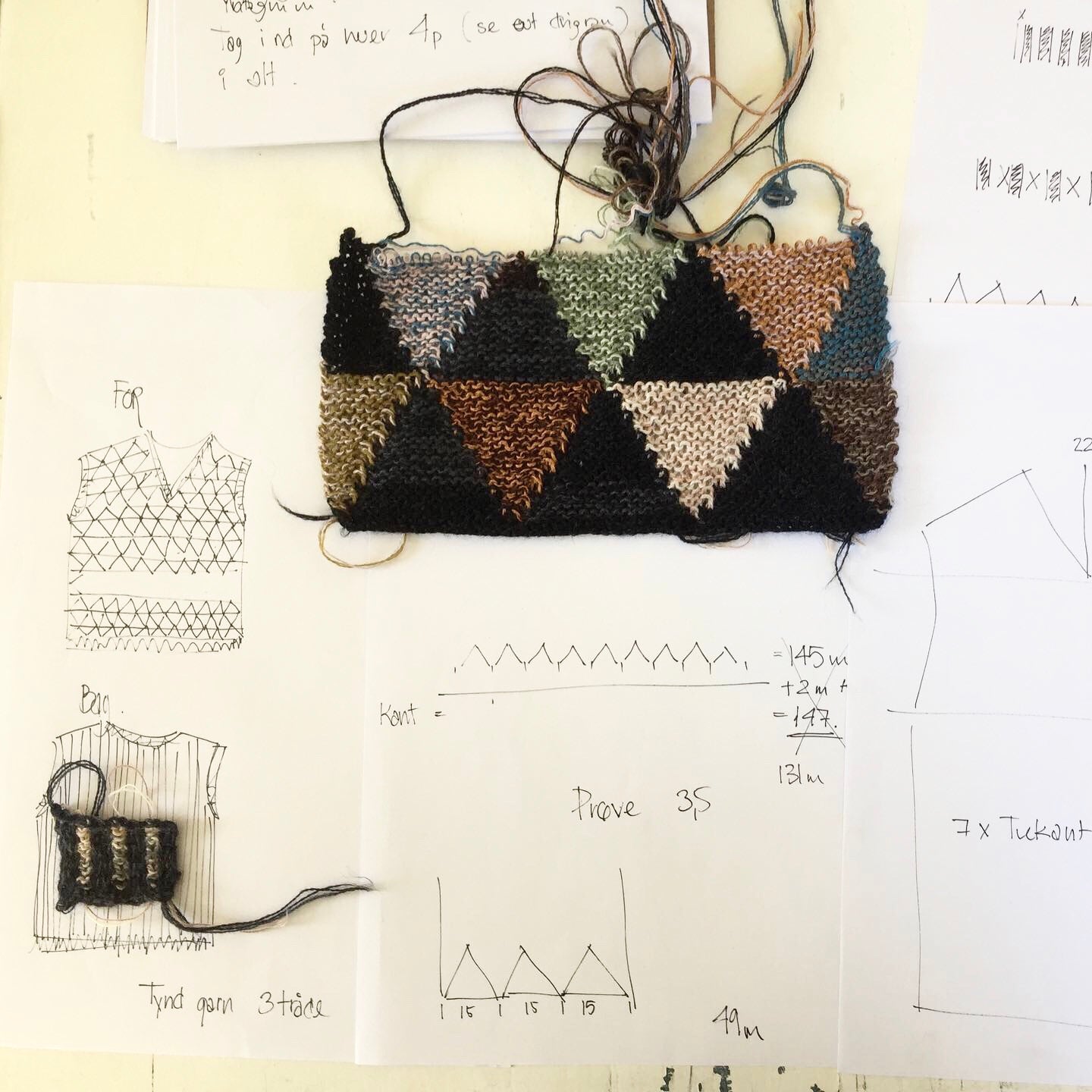 Der er brugt forskellige garnkvaliteter alle med en løbelængde på 100 g = ca. 1400 m